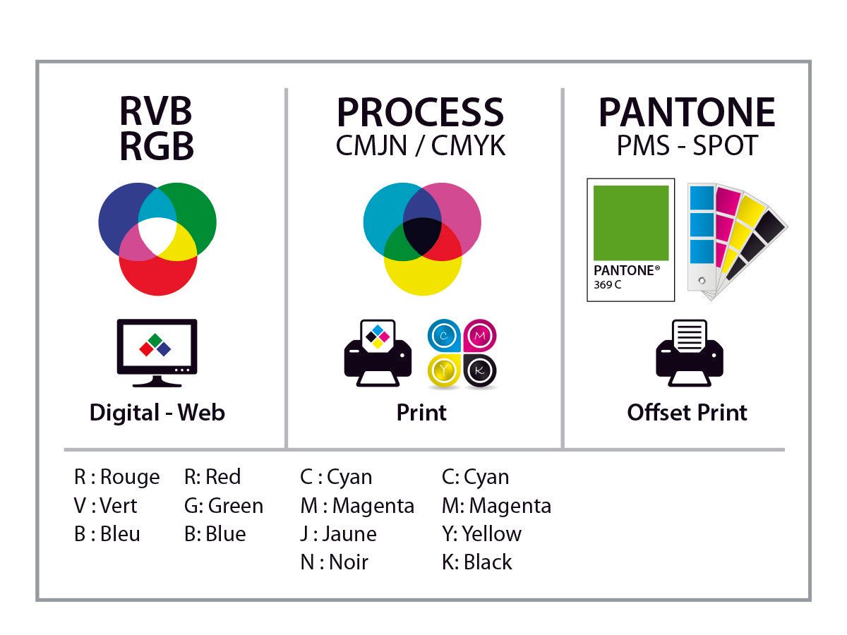 Si vous envoyez des fichiers en RVB / RGB, les imprimeurs les convertiront automatiquement en CMJN / CMYK et vous constaterez une grande différence de couleur entre la couleur désirée votre écran et votre document imprimé.