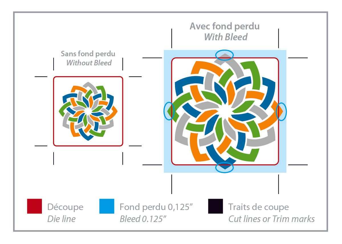 Si votre document comporte un fond de couleur, vous devez le faire dépasser du format final du document (fond perdu / bleed) pour couper dans la couleur et éviter un contour blanc.