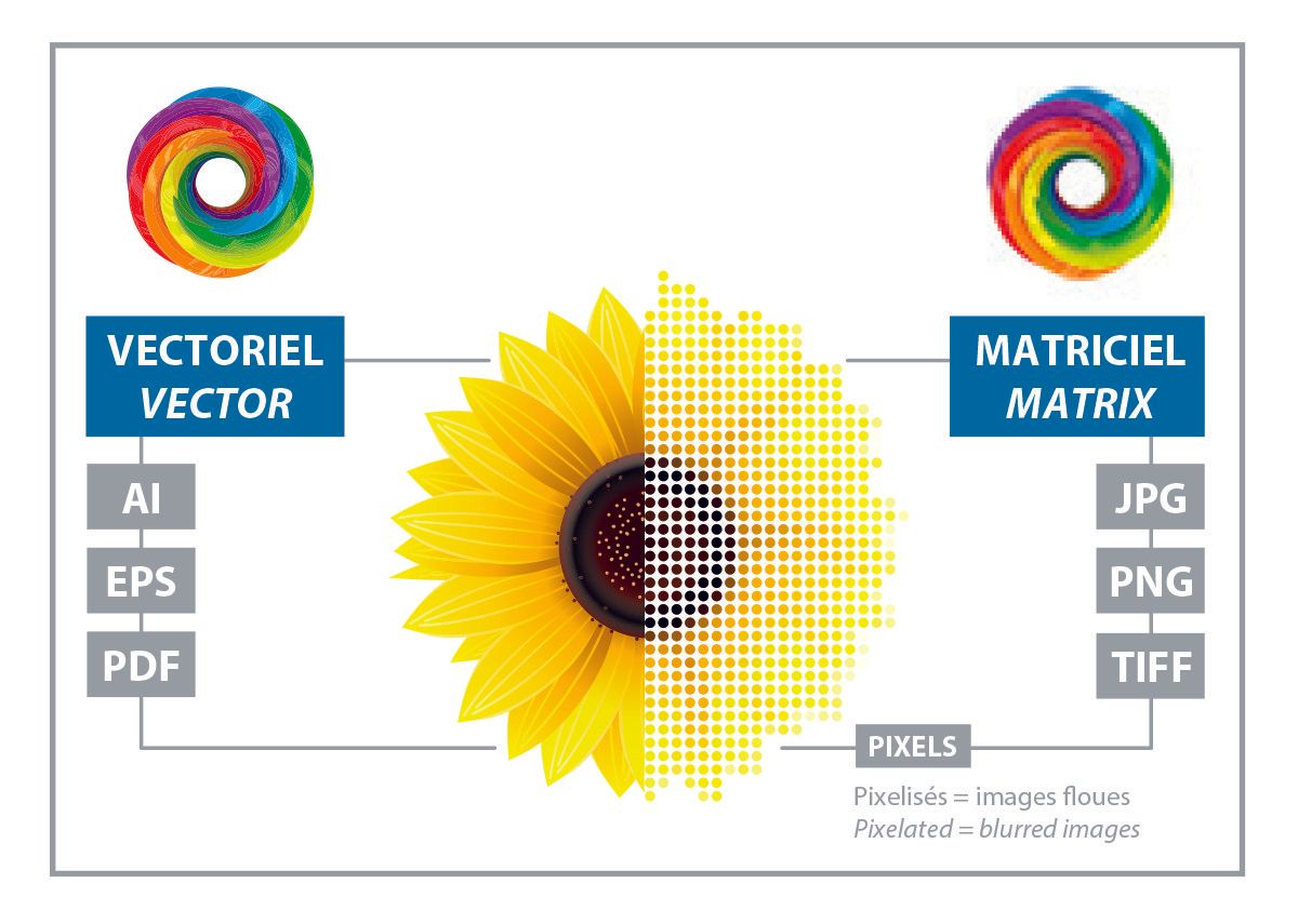 Les fichiers vectoriels s’agrandissent à l’infini, tandis que les fichiers matriciels sont pixelisés lorsqu’on les agrandit.